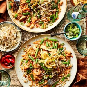 Nasi goreng van bloemkoolrijst en garnalen